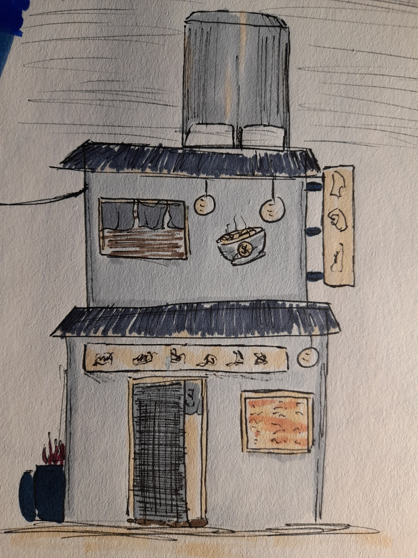 Dessin d'imagination représentant une devanture dans un style japonais. Feutre à alcool