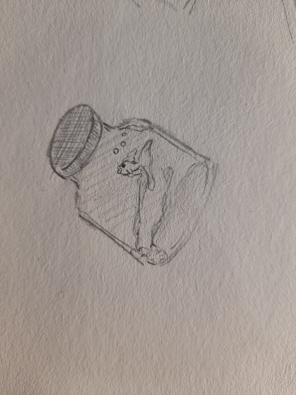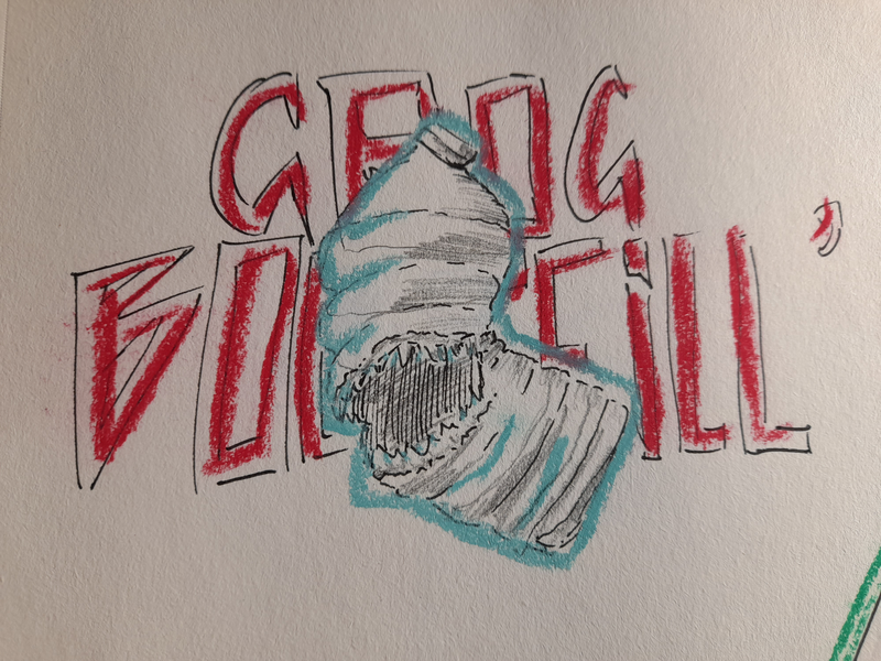 Dessin d'imagination représentant une bouteille monstrueuse. Réalisé au crayon et à la craie grasse en 10 minutes